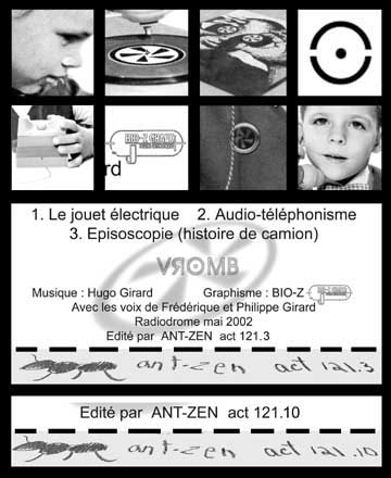18:00 Graphics and Layout: Bio-Z Additional voices: Frédérique Girard and Philippe Girard Info-text (Ant-Zen): After the pulsating soundscapes of the concept album 'Épisodes' and the electro-acoustic 'first chapter in an electronic opera for ultratonical machines' named 'mémoires paramoléculaire'; between hugo girard's legendary live appearance at the 'Mutek' festival in Montreal/Canada and the Maschinenfest 02' in Aachen/Germany, Ant-Zen presents this nicely designed tourne-disque in two different formats. 'Le tourne-disque' is more beat oriented which fits perfectly to vromb's live sets, but it will come as no surprise to those who own vromb's earlier works. Girard's music contains minimal electro rhythmic explorations beyond cold atmospheric soundscapes. There are also manipulated voices on this record - Hugo Girard implements the spoken words of his infant relatives Frédérique and Philippe. An excellent addition to the previous vromb releases and it is limited - so don't miss it...! |