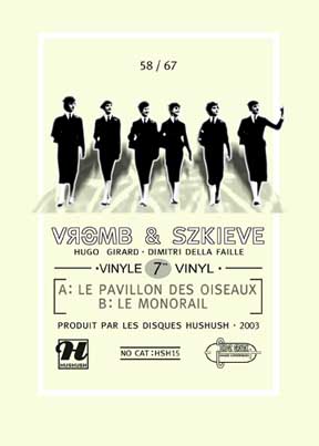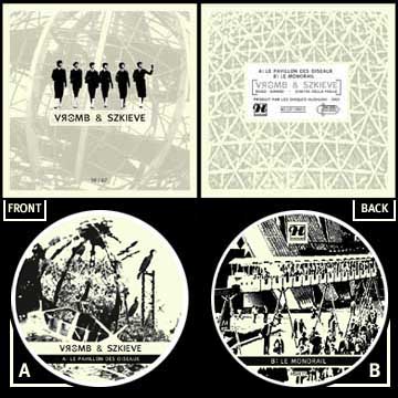 B: Graphics and Layout: Bio-Z Info-text (Disques Hushush): The monorail provided by les Enterprises Hushush will take you on a journey to our own World Fair, an exhibition for advanced technologies and oddities. Recorded on this seven inch vinyl is a visit to the Birds Pavilion, “le pavillon des oiseaux” as well as an overview of the site. Often remembered for the showing of tomorrow’s technological advancements, World Fairs presented many mechanical, electronic and magnetic types of equipment. Thought to be the way of the future, some of them remain now very odd pieces of history, yesterday’s tomorrows. This recording is the first collaboration effort for Vromb. The Montreal dark electronica wonder has teamed up with an almost Canadian fellow, Hushush’s headhoncho project, Szkieve. More information on Szkieve: http://www.szkieve.org/ |